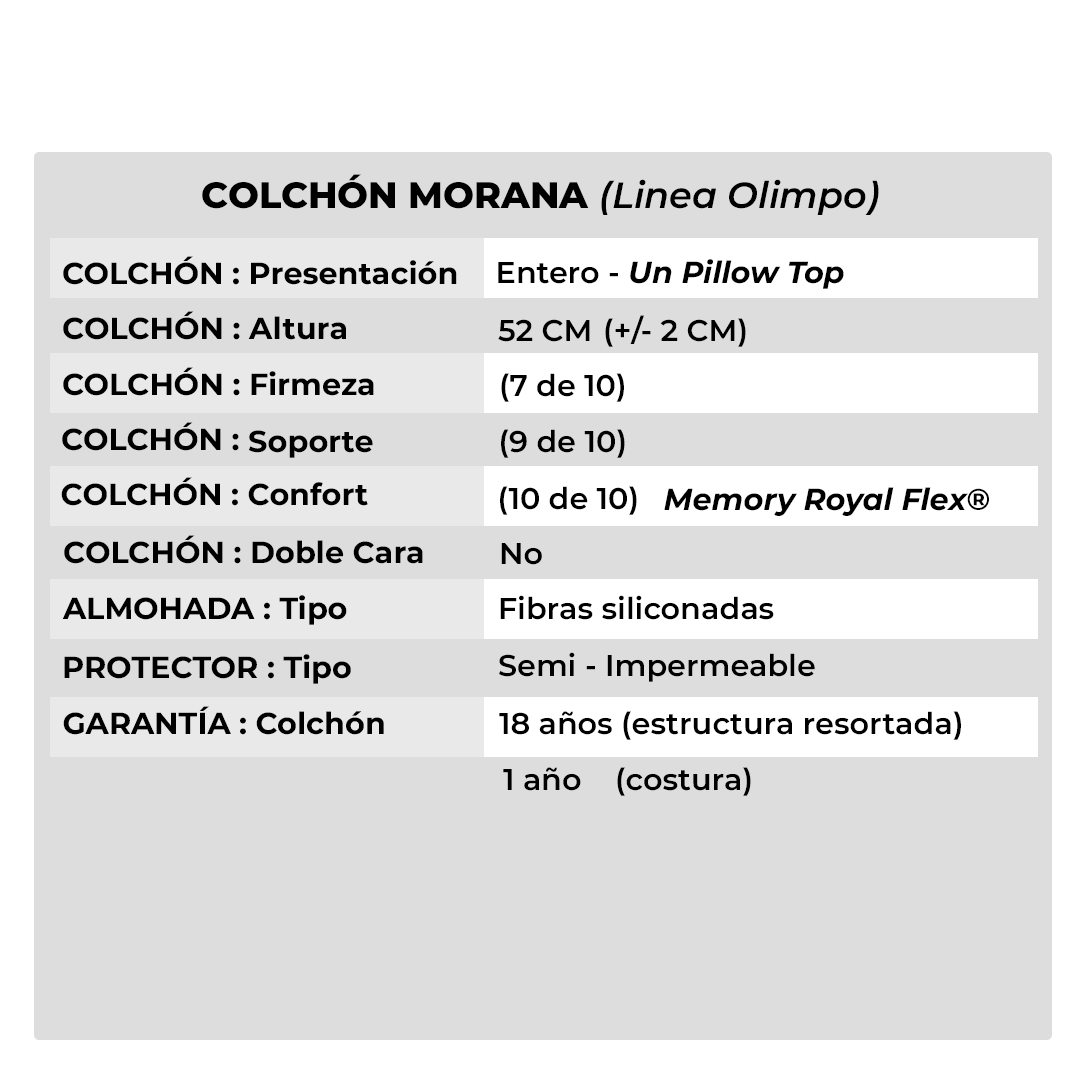El Morana es el modelo más exclusivo y robusto de la línea Olimpo. Su doble sistema de resortes —Bonell + Pocket— garantiza un soporte firme, adaptativo e independiente, ideal para parejas o personas con alta exigencia postural. Ambas estructuras están certificadas bajo la norma ISO 9001 (ICONTEC), validando su calidad y durabilidad a nivel internacional.