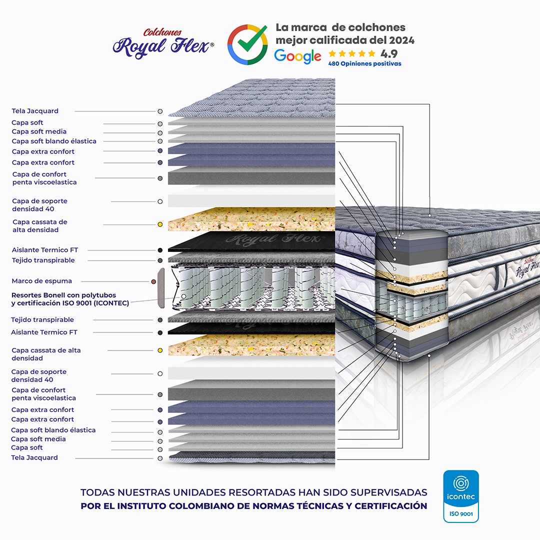 Cuenta con una unidad de resortes tipo Bonell de 6 vueltas por resorte, exclusiva en el mercado colombiano, que brinda mayor estabilidad, soporte y durabilidad. Esta estructura está certificada por ICONTEC bajo la norma ISO 9001, garantizando calidad internacional.