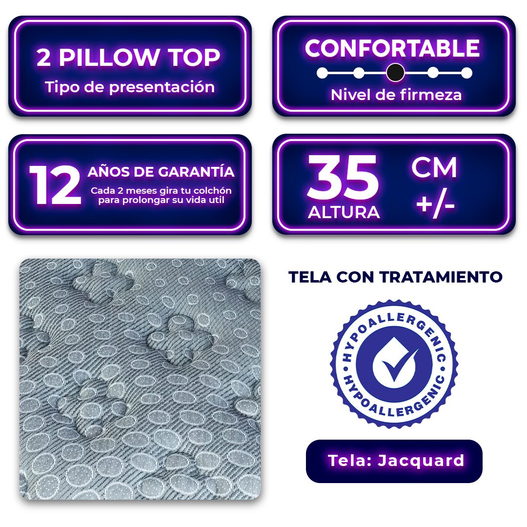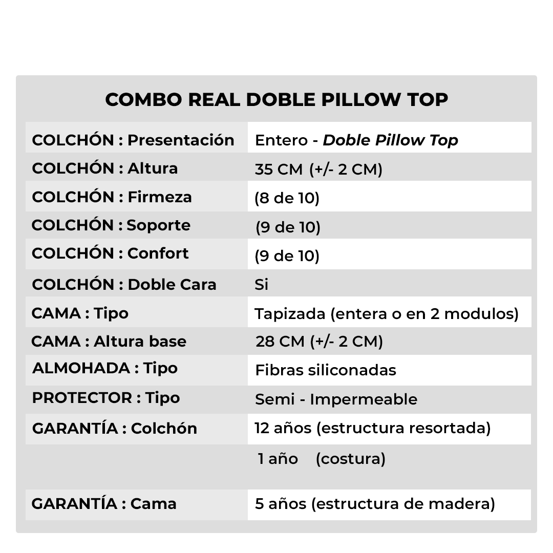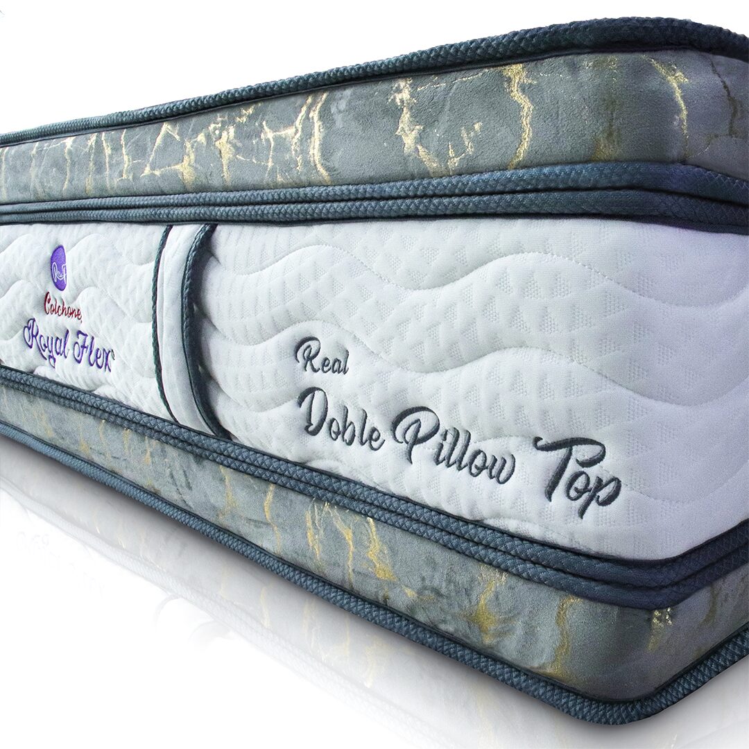 El colchón Real Doble Pillow Top de Royal Flex ofrece una combinación única entre soporte firme, elegancia y tecnología de confort. Su sistema doble pillow top garantiza una sensación envolvente al acostarse, con una altura total de 35 cm y capas de alta densidad que proporcionan estabilidad sin sacrificar suavidad.