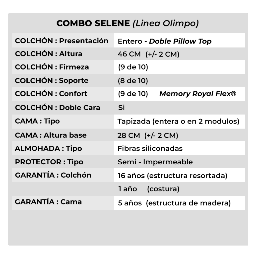 El Selene eleva la experiencia de descanso con doble pillow top de memory foam, tela aloe vera y una altura de 46 cm. Su unidad de resortes está certificada con ISO 9001, validada por ICONTEC, lo que garantiza máxima calidad y durabilidad. La cama base, fabricada en madera pino reforestado y tapizada a tu gusto, aporta firmeza y diseño. El colchón puede personalizarse con bordado especial. Garantía: 16 años para el colchón y 5 años en la cama base.