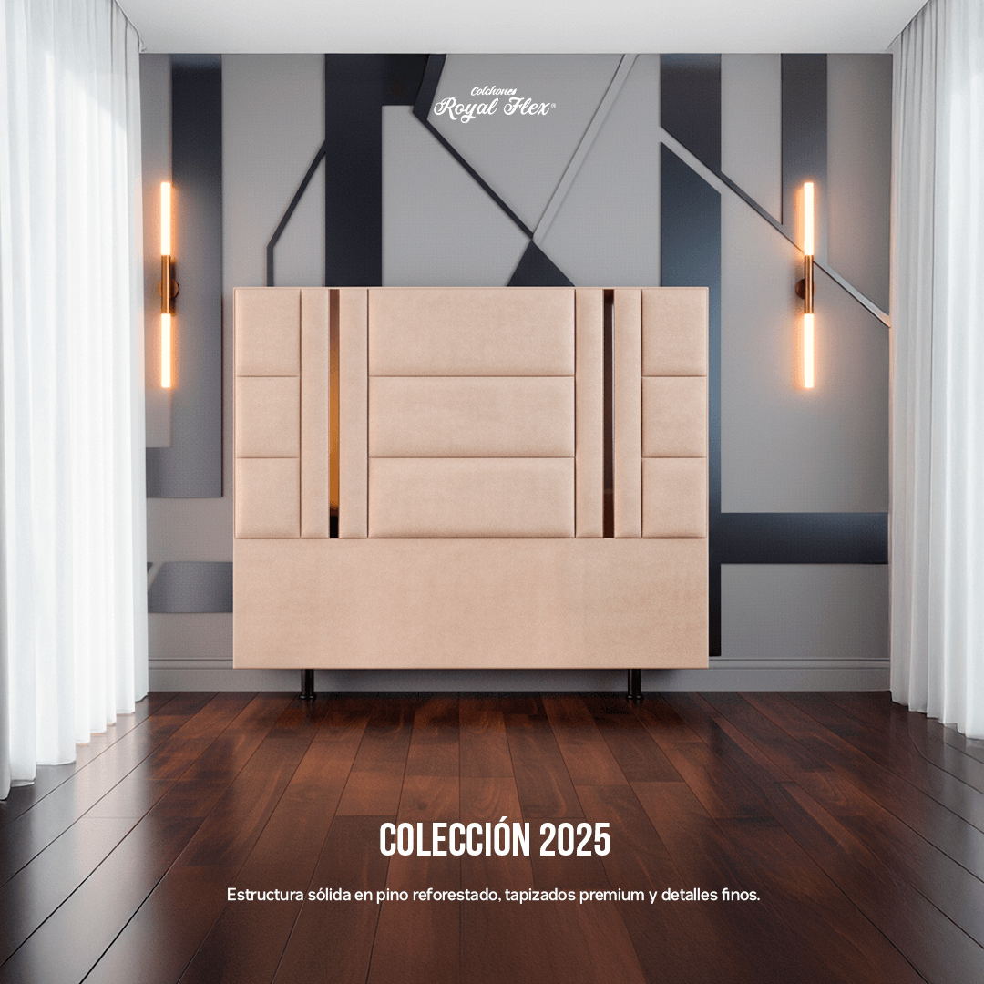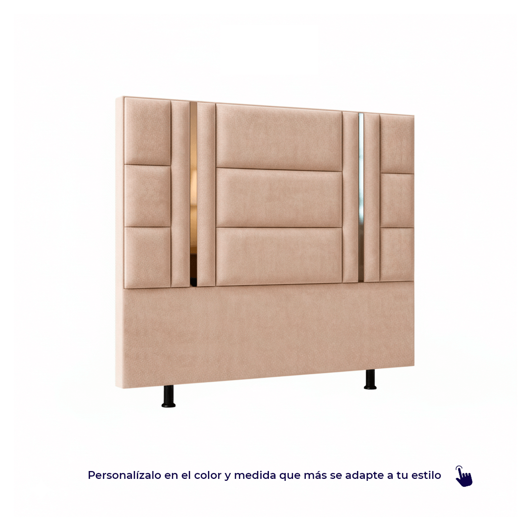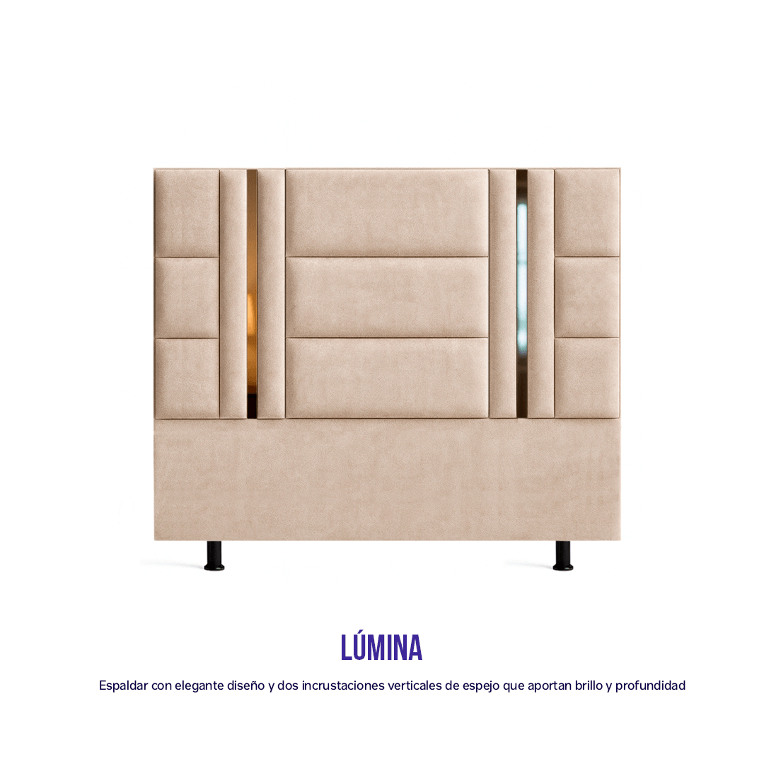 El espaldar Lumina redefine la elegancia moderna con un diseño innovador que incorpora espejos sutilmente integrados, aportando amplitud, luminosidad y un toque de sofisticación al dormitorio.
