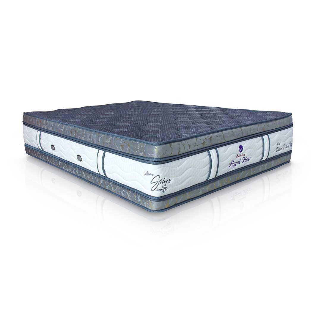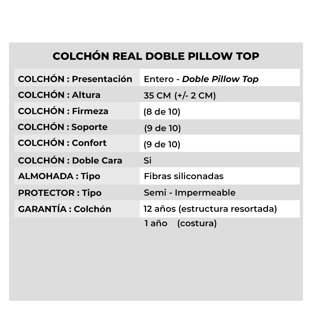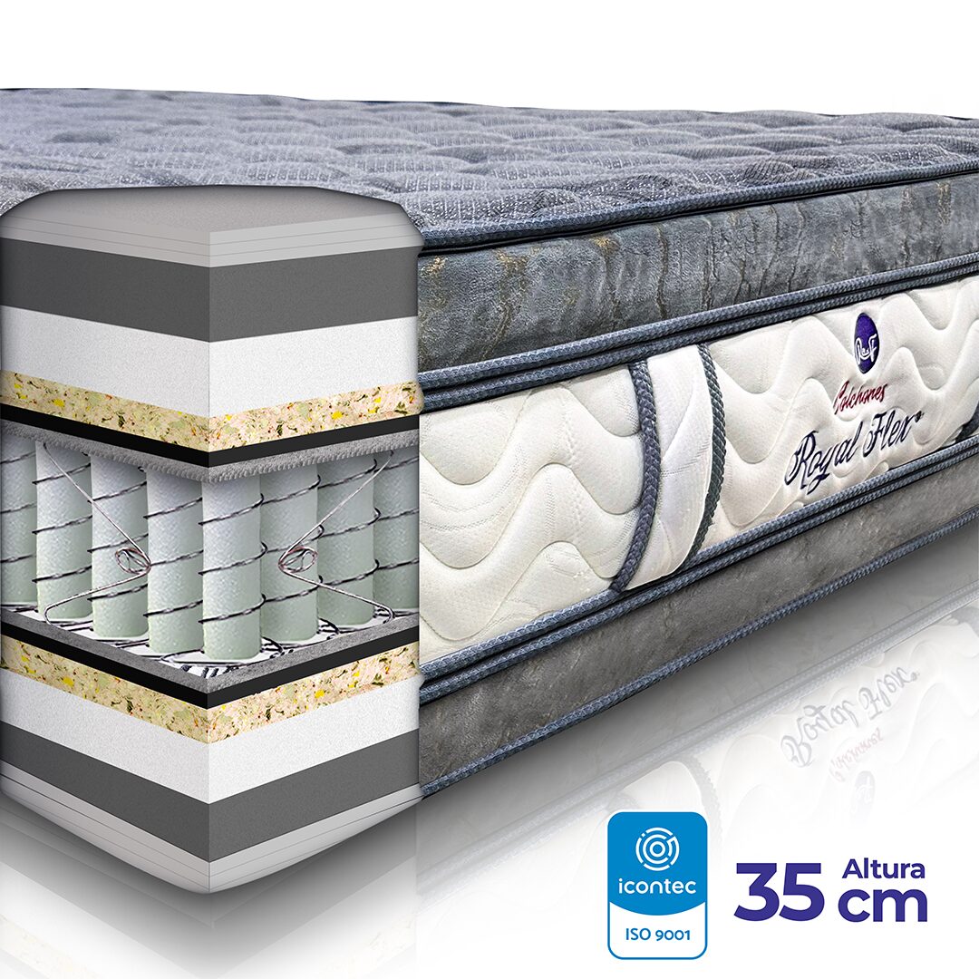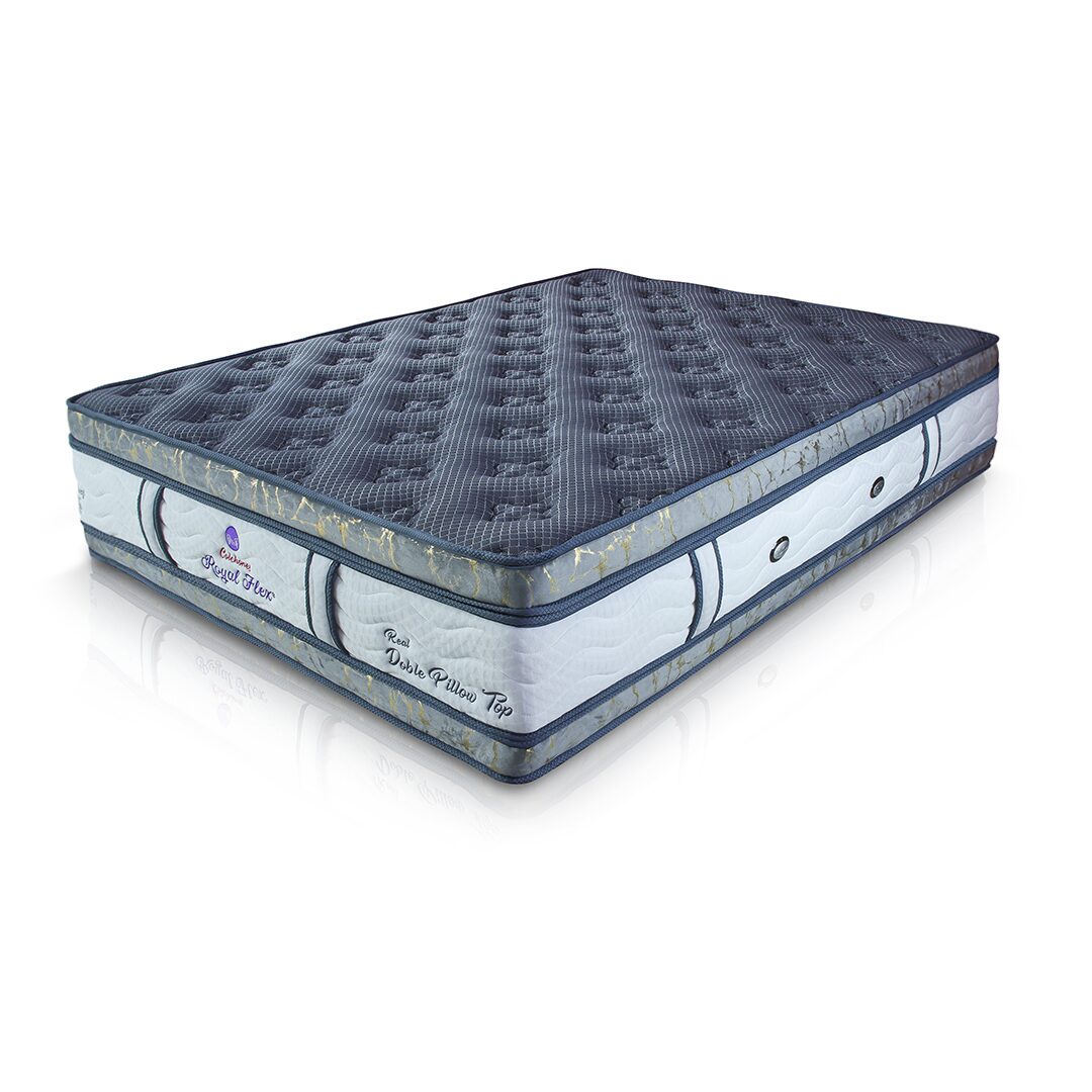 El colchón Real Doble Pillow Top de Royal Flex ofrece una combinación única entre soporte firme, elegancia y tecnología de confort. Su sistema doble pillow top garantiza una sensación envolvente al acostarse, con una altura total de 35 cm y capas de alta densidad que proporcionan estabilidad sin sacrificar suavidad.