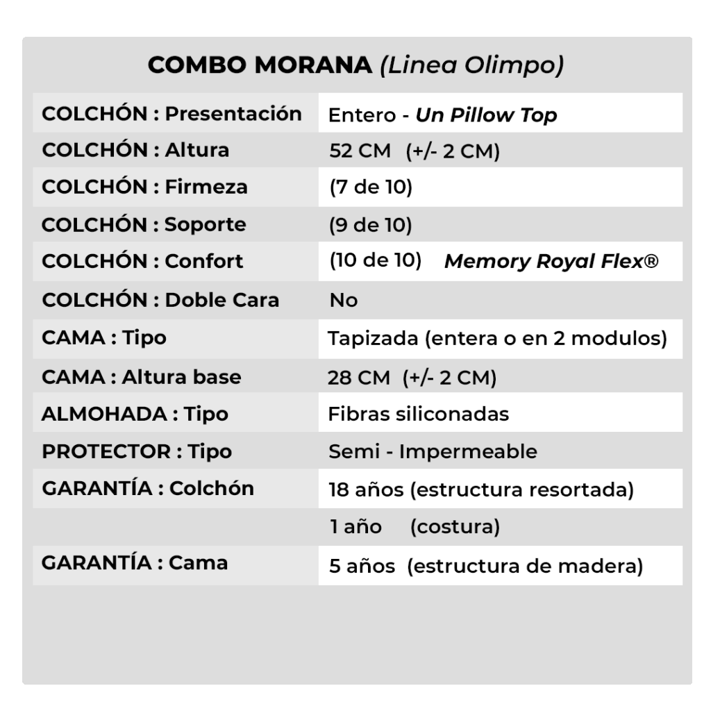 El combo incluye una cama base fabricada en pino reforestado, tapizada con el color y textura que prefieras. Garantía de 18 años para el colchón y 5 años para la cama base. Un conjunto pensado para quienes no aceptan menos que lo mejor en descanso, diseño y durabilidad.