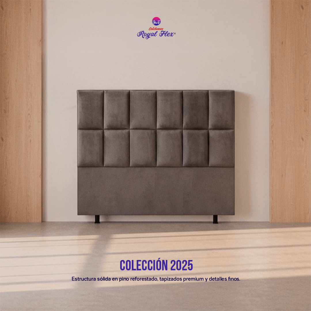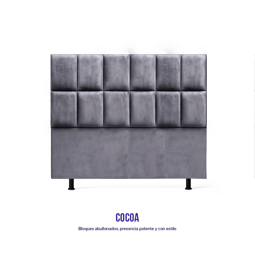 El espaldar Cocoa destaca por su diseño de bloques acolchonados en alto relieve, creando una presencia visual potente y elegante. Su estilo ordenado y moderno lo convierte en una pieza ideal para quienes buscan un dormitorio imponente y con carácter.