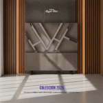 El espaldar Gold Salmón destaca por su diseño moderno con líneas dinámicas en espejo que se cruzan de forma limpia y elegante. Su composición geométrica aporta un efecto visual sofisticado y contemporáneo, ideal para habitaciones que buscan un toque de lujo moderno.