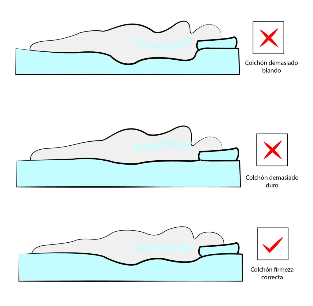La clave está en el equilibrio: Un colchón debe ser lo suficientemente firme para dar soporte a la columna, pero también adaptable para acomodarse a las curvas naturales del cuerpo. Un colchón excesivamente blando provoca hundimientos que desalinean la columna. Uno demasiado duro genera puntos de presión en caderas y hombros.