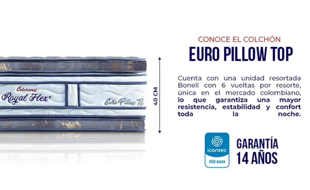Colchón Euro Pillow Top: Nuestro modelo más vendido para alivio de dolor de espalda. El Pillow Top de 3 a 5 centímetros permite que la espuma se acomode a tu cuerpo, evitando posturas rígidas y brindando soporte adecuado para la columna vertebral. Combina firmeza media-alta con una capa superior ultra confortable. Desde $1.649.000.